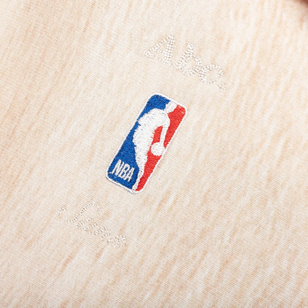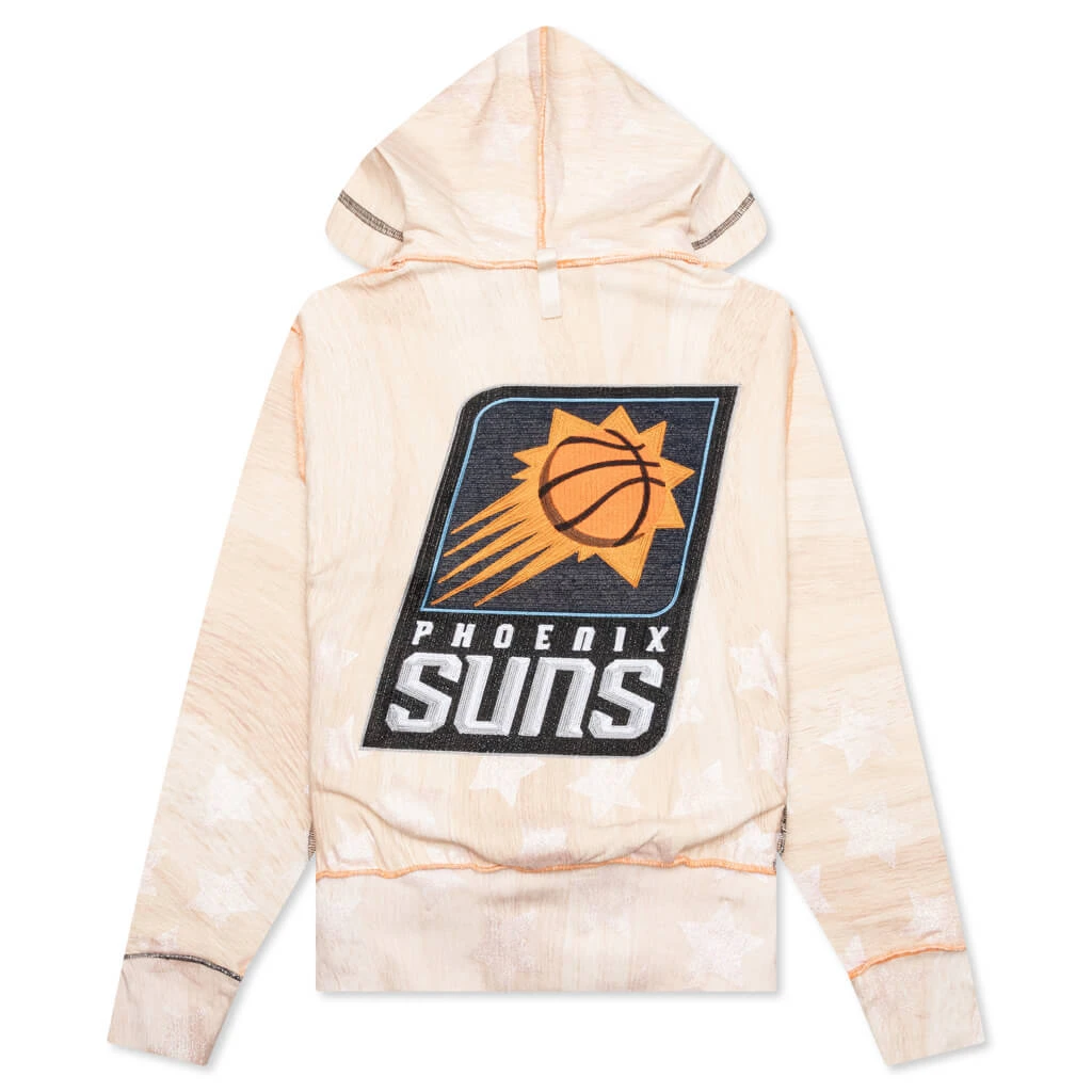 Advisory Board Crystals teams up with the NBA to create a collection of hoodies representing various teams. The garment is cut from cotton and has an all-over print that resembles a wooden basketball court. It includes an adjustable drawstring hood and boasts an inside-out athletic construction with exposed seams and contrast stitching that match the NBA’s colors. Embroidered Phoenix Suns branding can be seen on the back, and an ABC woven tag is placed near the kangaroo pocket. The signature pull tab on the back neck completes the design.