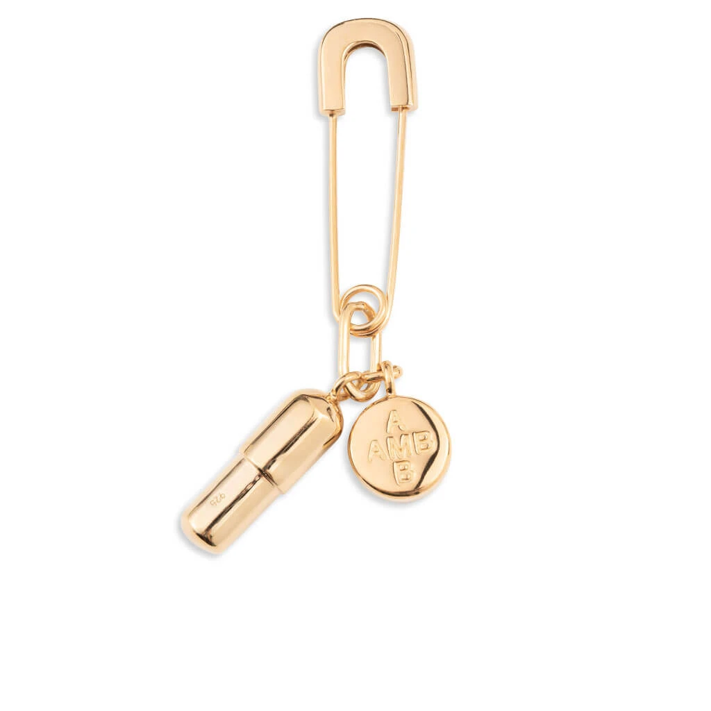 The latest accessory within Ambush’s repertoire includes the Pill Charm Earring which highlights engraved branding within its design. The single earring is constructed with quality silver and a gold overlay for its distinct color. A safety pin design provides a secure closure, completing its design.