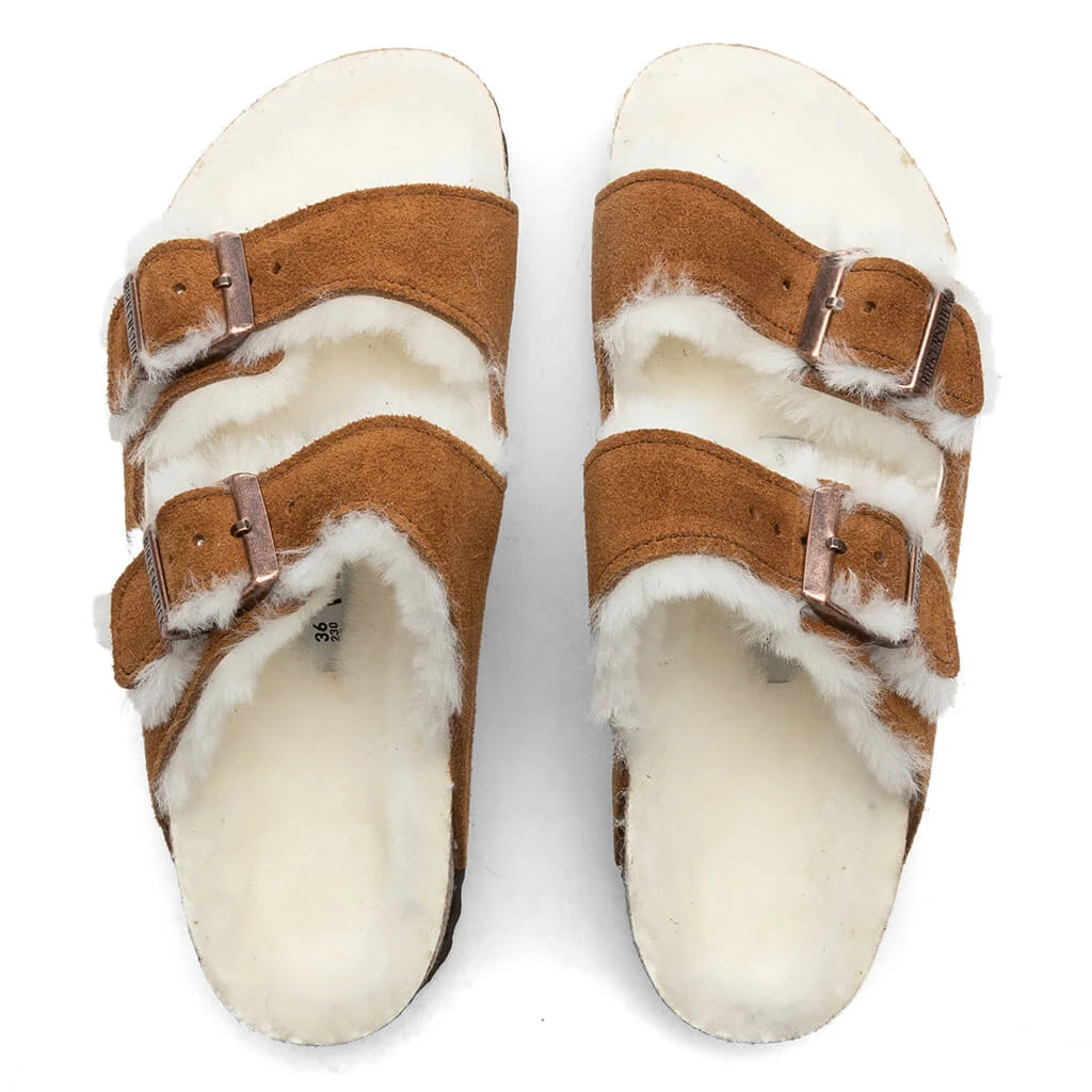 Birkenstock reimagines the traditional Arizona model with a Shearling lining for a luxe and smooth experience. A cork-latex footbed features an EVA sole for comfort which works alongside the suede upper straps. Functional details include adjustable closures and a cork-latex footbed for optimal cushioning.Â