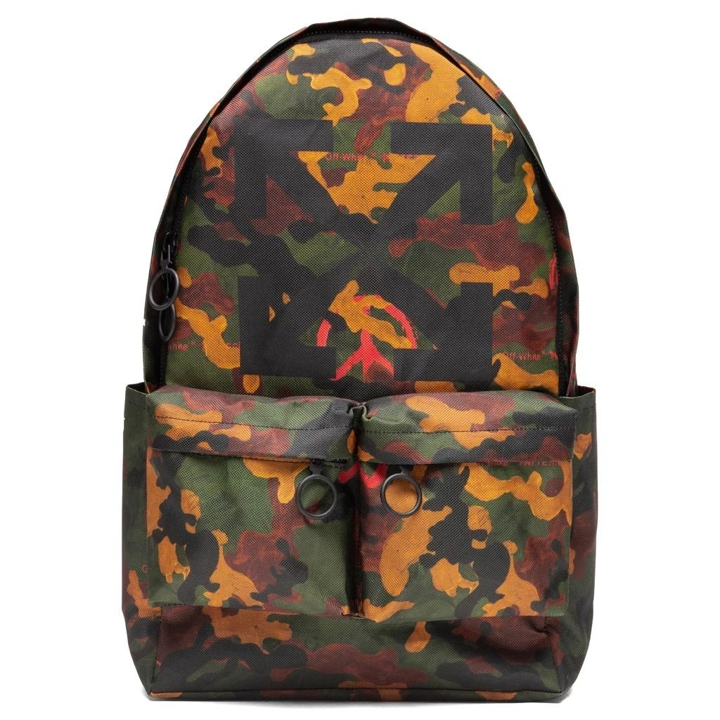 Off-White c/o Virgil Abloh is a fashion label rooted in current culture at a taste-level particular to now. Manufacturing is based in Milan with a core value of the brand to be made from the best available and particular opinion regarding fabric, fit and fabrication. Pictured is the Off-White c/o Virgil Abloh Camou Arrow Backpack in All Over Black.