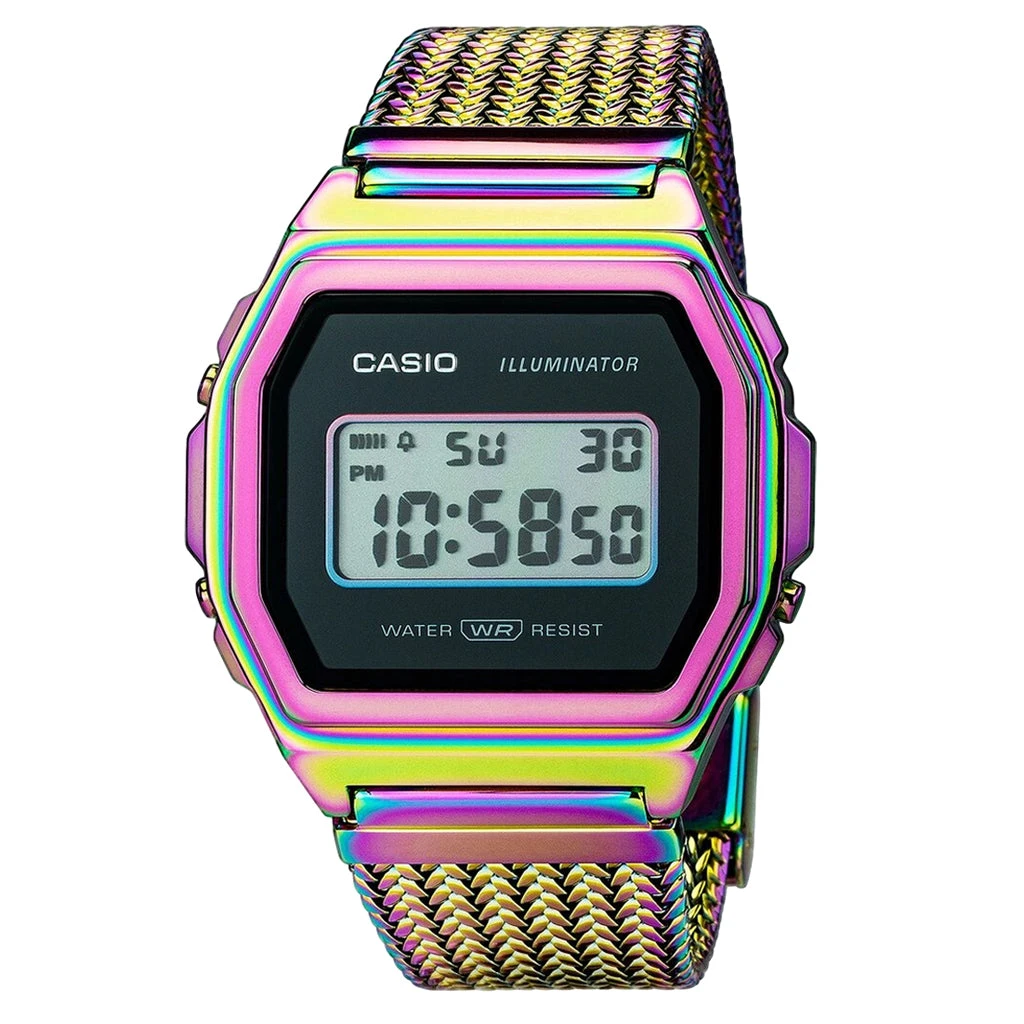The Casio A1000PRW-1 watch features a metal case with a 1/100 second stopwatch in addition to its super LED light. Pink Rainbow IP coating is seen on the case and Milanese strap. The solid stainless steel case is an additional attribute, in addition to its water-resistant material and daily alarm component.