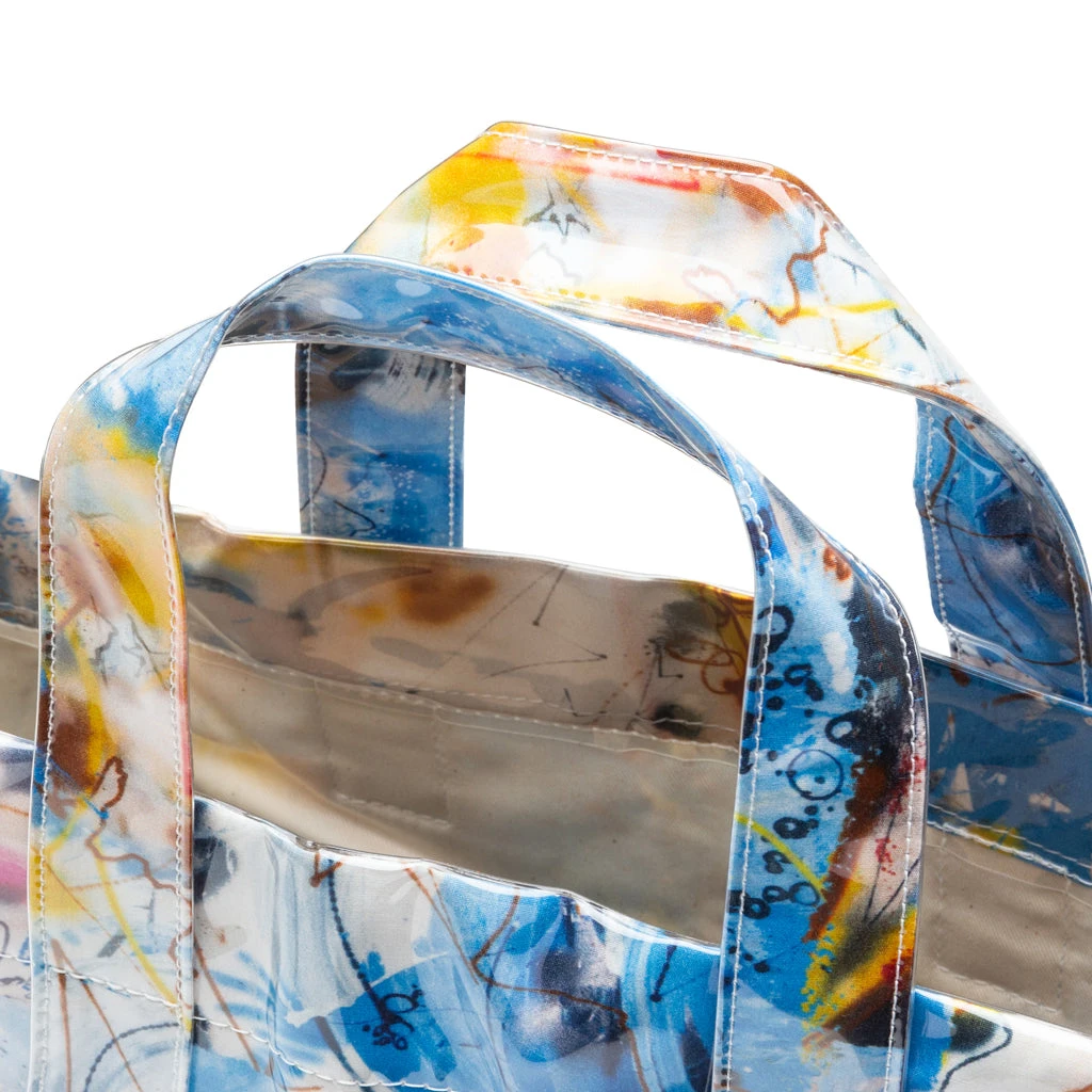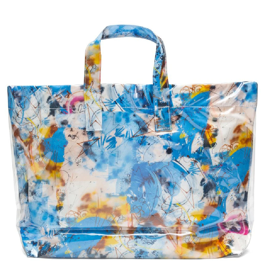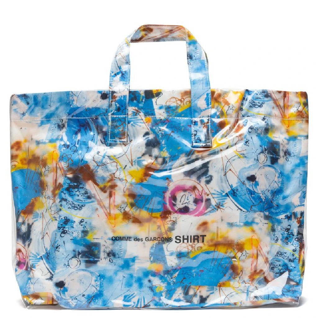 Comme Des Garcons teams up with New York graffiti artist Futura to bring you these statement pices. Each piece consists with the classic Comme Des Garcon silhoutte paired with vibrant art pieces. Pictured is the Comme Des Garcons SHIRT x Futura Wide Tote Bag in Blue.