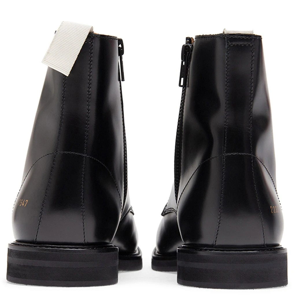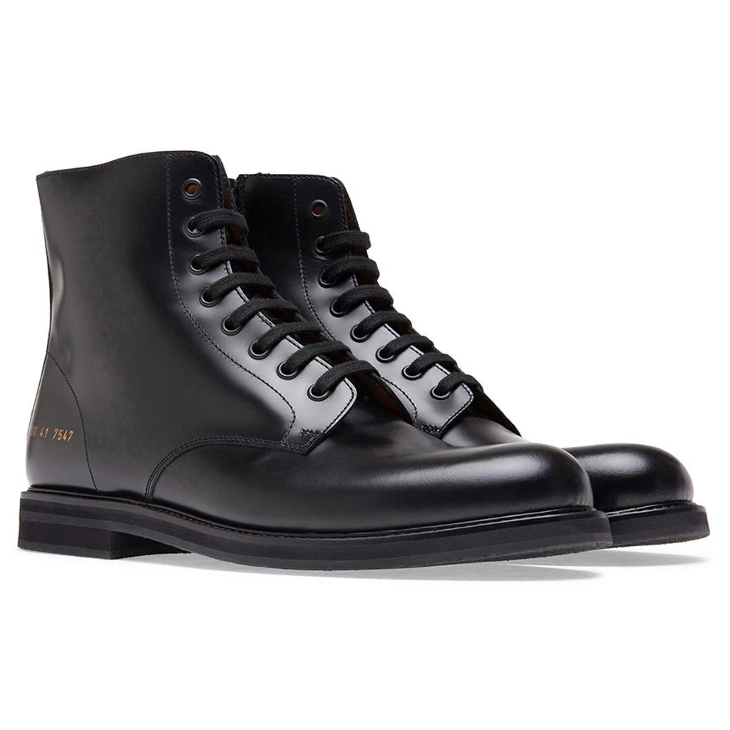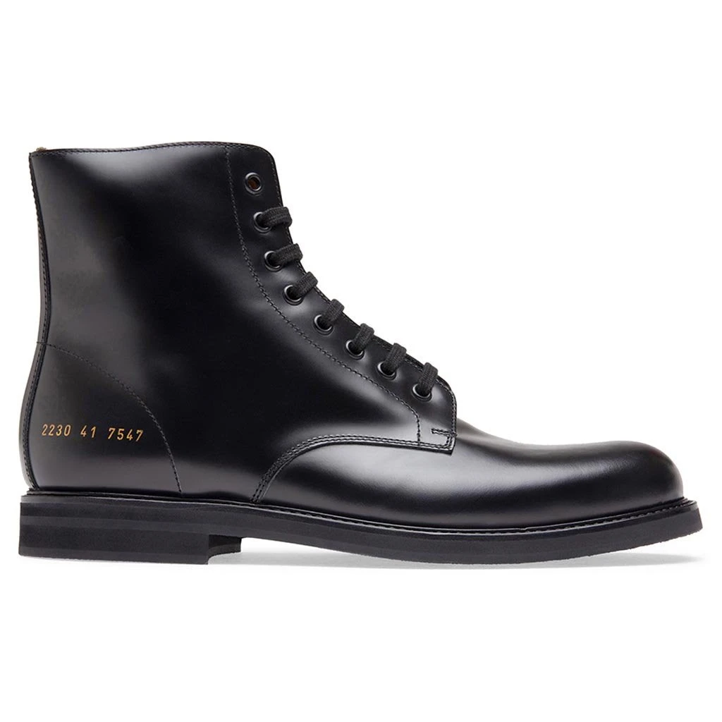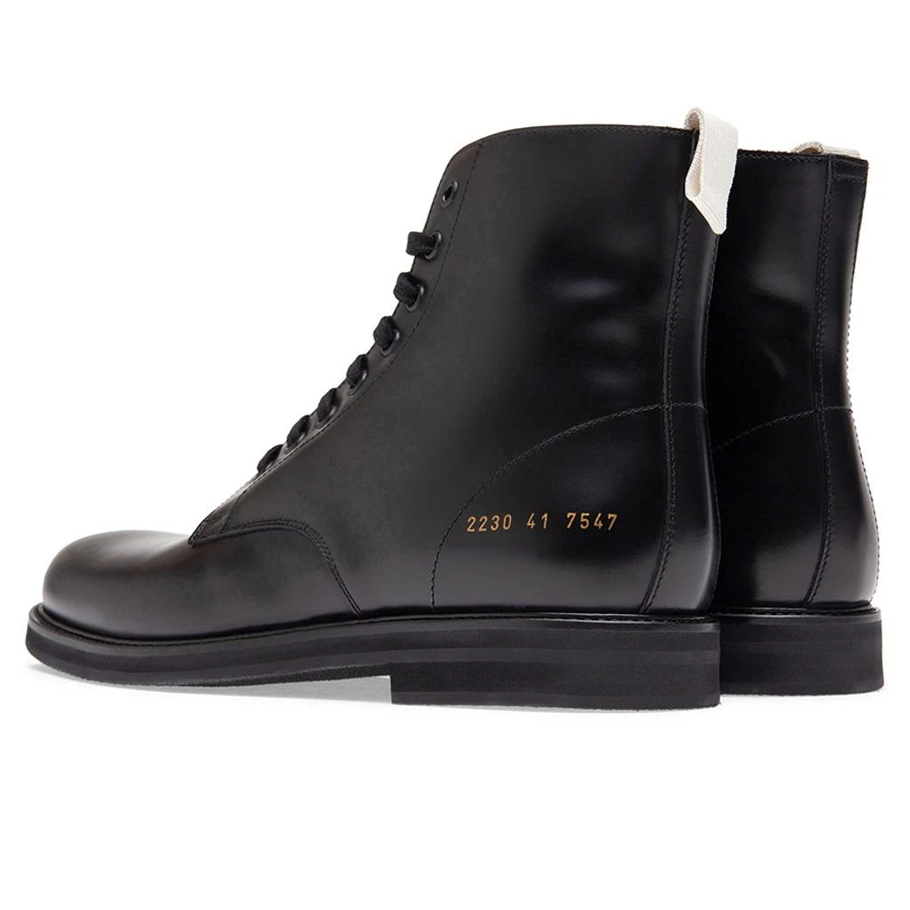 Founded by Prathan Poopat and Flavio Girolami in 2004, Common Projects are best known for their signature gold stamp at the heel highlighting style and size. Assembled in Italy using the highest-quality materials, Common Projects pushes the standard in luxury footwear. Pictured is the Common Projects 2230 Standard Combat Boot in Black.