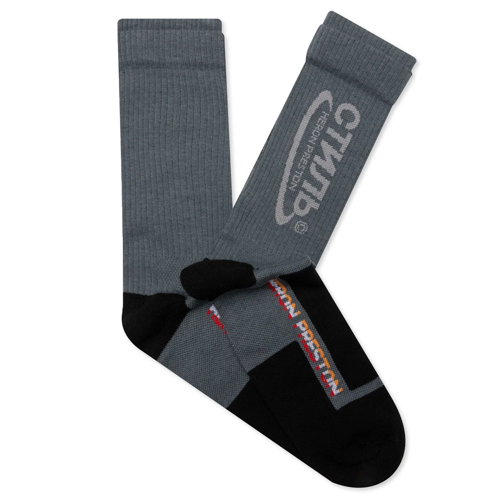 Heron Preston is the true embodiment of an artist born of the post-internet generation. Multi-faceted and genre-bending, he has become a cultural icon in youth culture, known for his bold aesthetics. His impressive bodies of work is a commitment to innovation, experimentation and unpredictability. Pictured is the Heron Preston CTNMB Halo Double Cuff Socks in Anthracite.