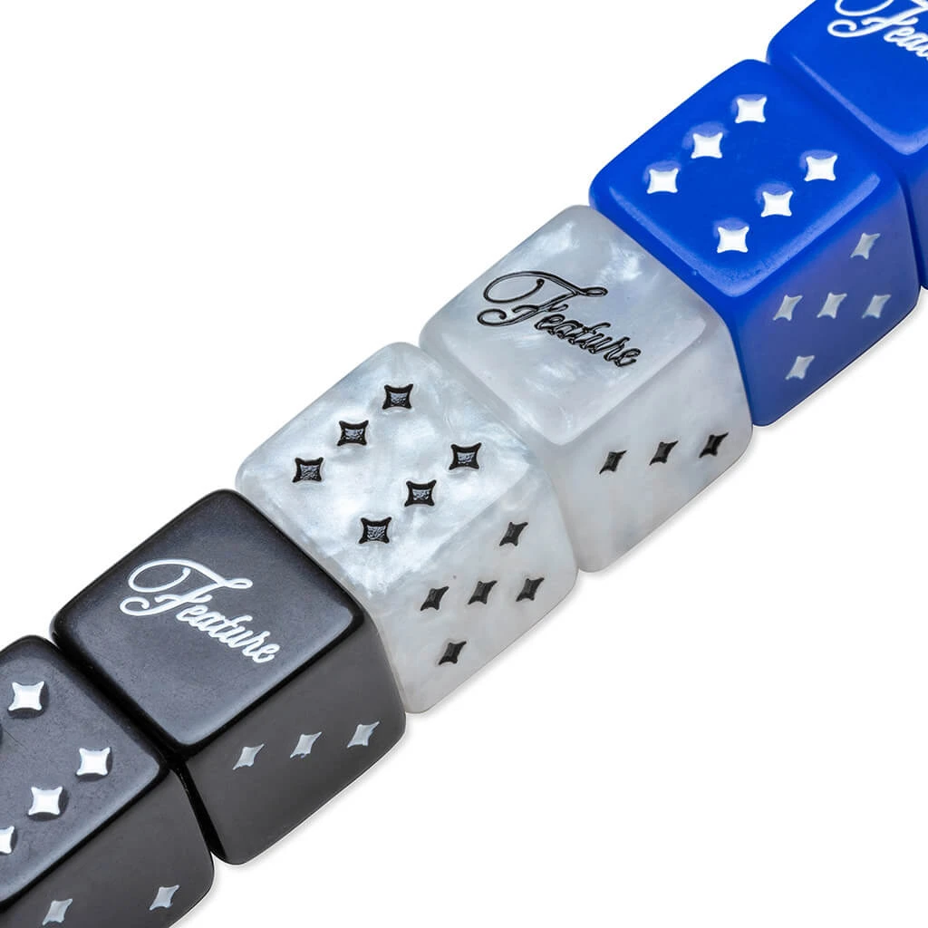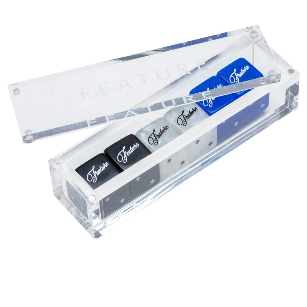 Perfect for game night, FEATURE introduces the FEATURE Dice Set. Including three dice in Dazzling Blue, Pearlescent, and Black colorways, the three dice are presented in a thick acrylic case that protects them. A printed FEATURE logo resides at the top lid, while the magnets help secure the design in place. The dice themselves are made of resin material, while the numbers at the sides are presented in a star graphic, referencing the iconic Stardust Hotel in Las Vegas. The script FEATURE branding on one of the sides completes the set.