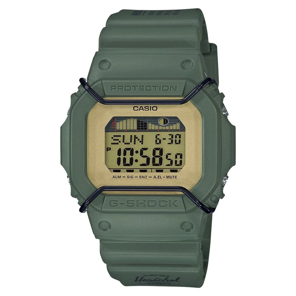 G-Shock is a line of watches manufactured by Casio, designed to resist mechanical shock and vibration. Born at a time when watches were generally considered fragile instruments, G-SHOCK began as the dream of a young engineer, who wanted to create “a watch that doesn’t break, even when dropped.” Pictured is the G-Shock x Herschel GLX5600HSC-3 in Military Green.