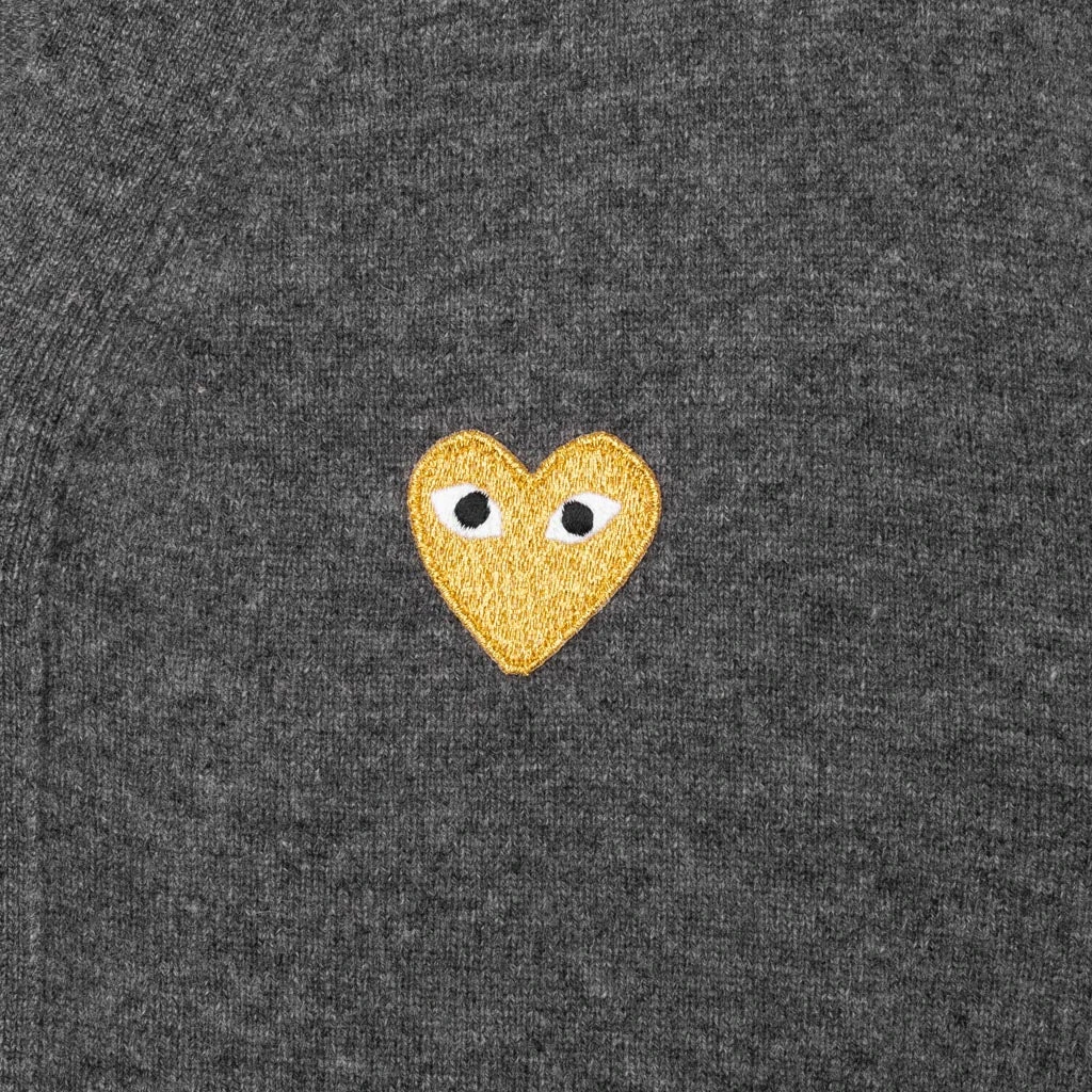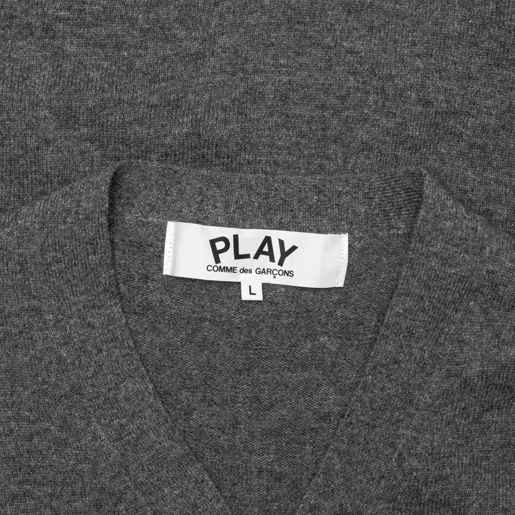 The concept of the Comme des Garcons PLAY line is design by not designing. Â Characterized by the iconic red heart logo designed by artist Filip Pagowski, the line is a collection of unisex basics, fragrances, and footwear for those who enjoy simplicity. Â Pictured is the Comme Des Garcons PLAY Gold Heart Cardigan in Grey.