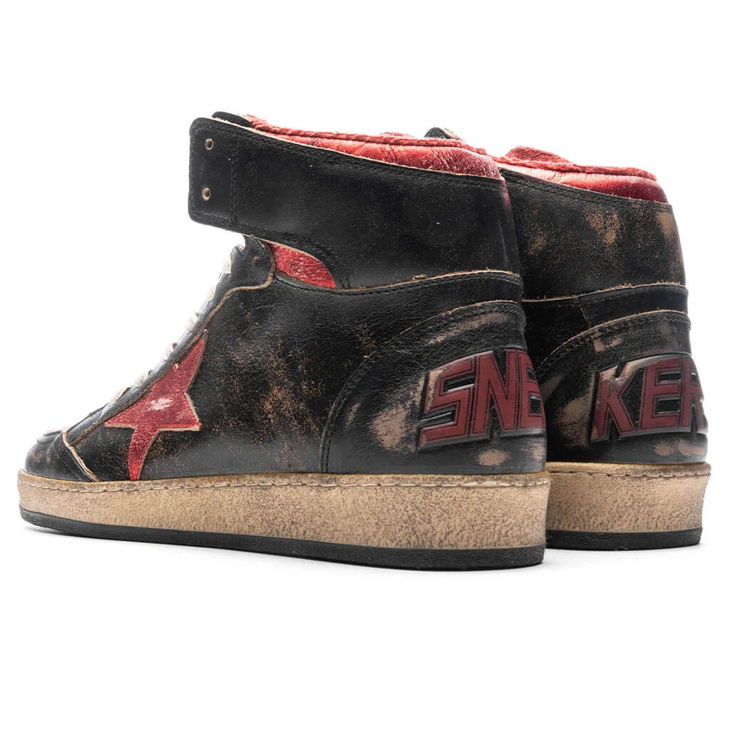 The Golden Goose Sky Star makes an impression with its premium aesthetic. The sneaker features a glossy leather upper and is treated with a distressed and worn-out effect. A metallic leather star and heel tab are placed, while signature branding is printed at the ankle. The nylon tongue and metallic leather toe provide additional dimension. The rubber outsole underneath supports the remainder of the look.