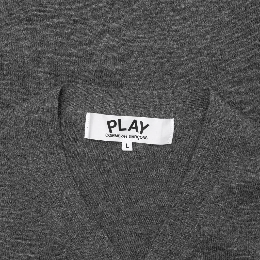The concept of the Comme des Garcons PLAY line is design by not designing. Characterized by the iconic red heart logo designed by artist Filip Pagowski, the line is a collection of unisex basics, fragrances, and footwear for those who enjoy simplicity. Pictured is the Comme des Garcons PLAY Knit Cardigan Red Heart in Grey.