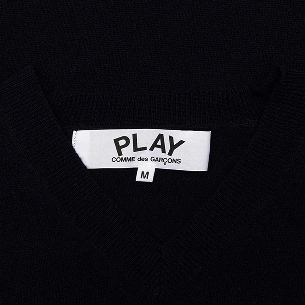 The concept of the Comme des Garcons PLAY line is design by not designing. Characterized by the iconic red heart logo designed by artist Filip Pagowski, the line is a collection of unisex basics, fragrances, and footwear for those who enjoy simplicity. Pictured is the Comme des Garcons PLAY Knit Cardigan Red Heart in Navy. AZ N008 051 2