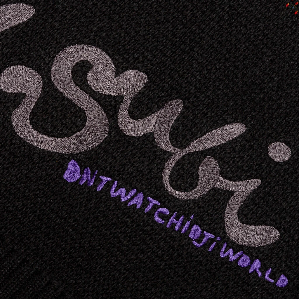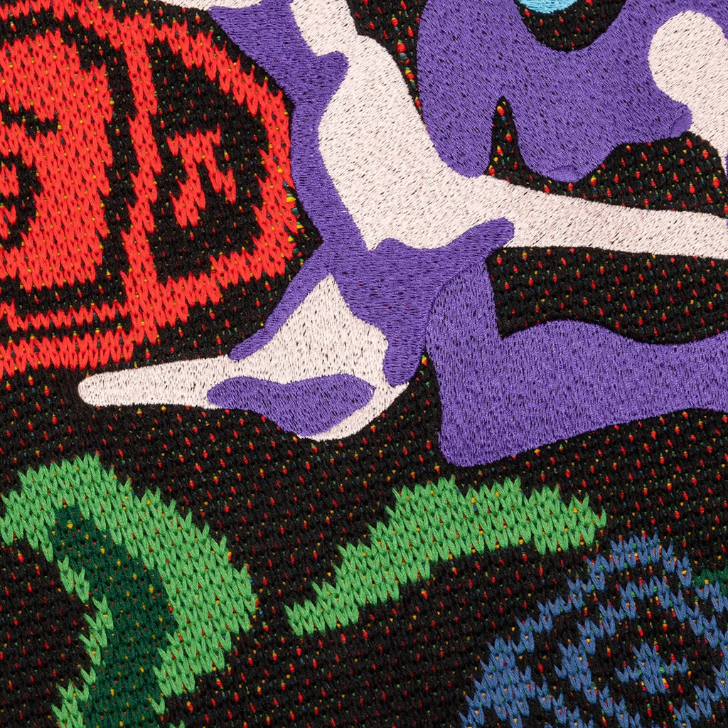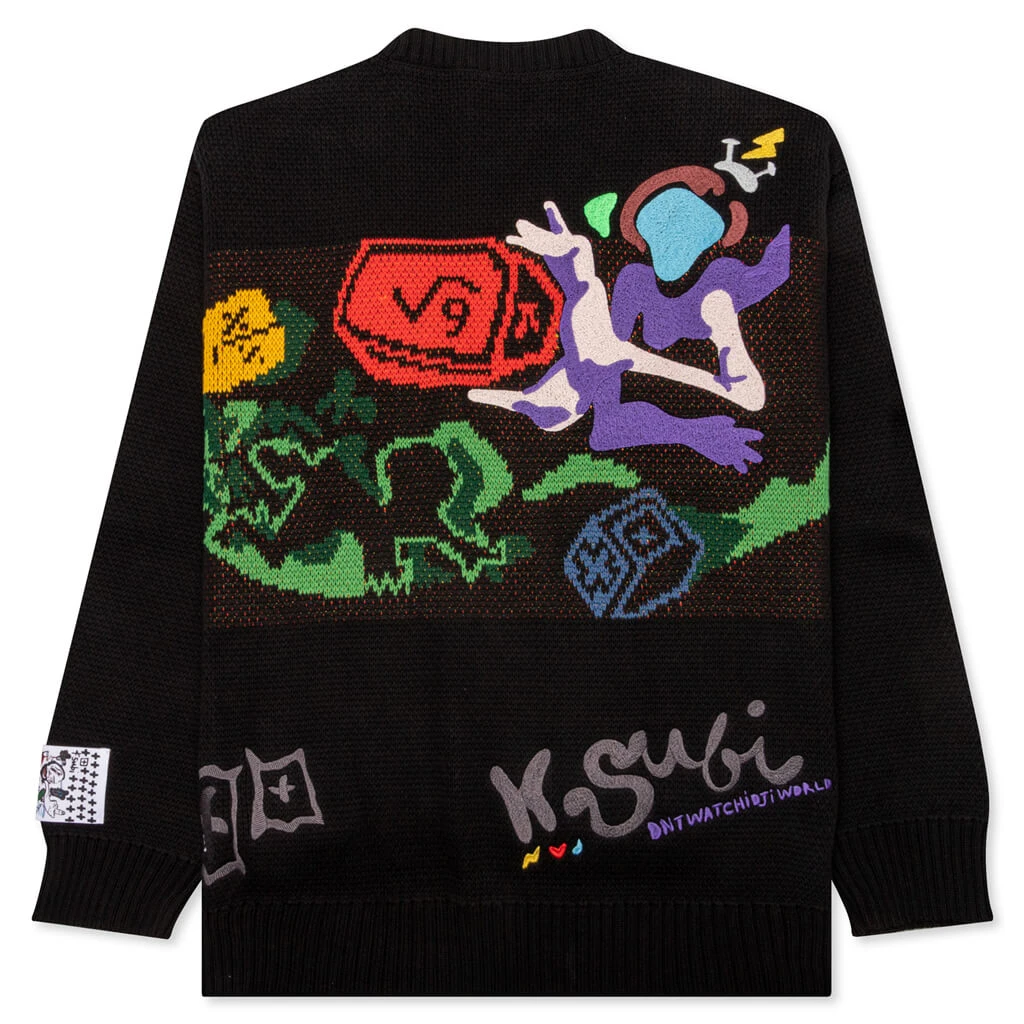The Ksubi Kardigan Communicate features a high-quality premium cotton knit design that features stitched artwork into the crew. Collab branded buttons make an appearance as well as a collab art tab at the left sleeve. The artwork is knitted into the crew using a special intarsia technique for an authentic feel.