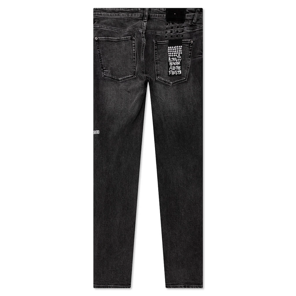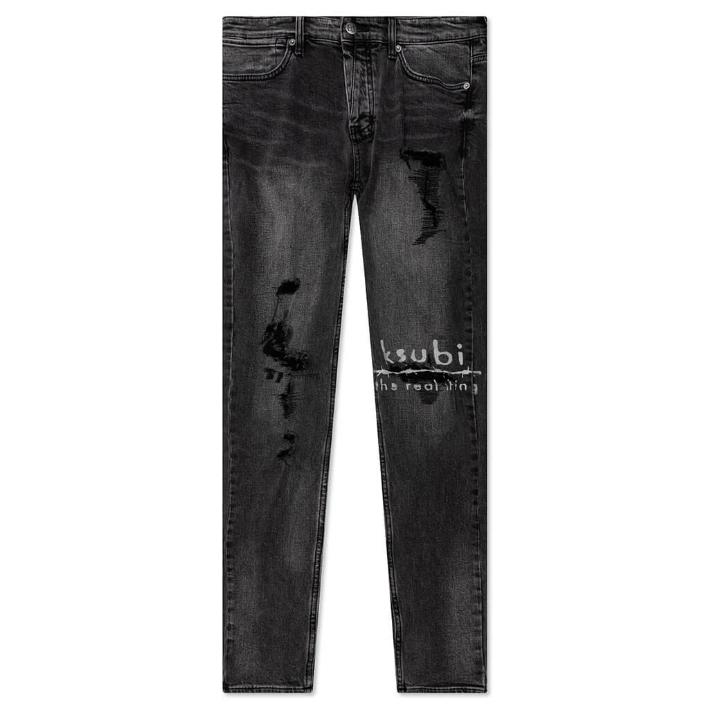 The Van Winkle from Ksubi elevates the traditional pair of jeans. Crafted from a blend of cotton and lycra, the jeans are made for a mid-rise and skinny fit. Unique angled belt loops and a front fly seam. The stretch denim incorporates a washed black color, and features knee decon, front knee print, and signature Ksubi branding. A signature weaved pocket tag and branded hardware tie together the silhouette.