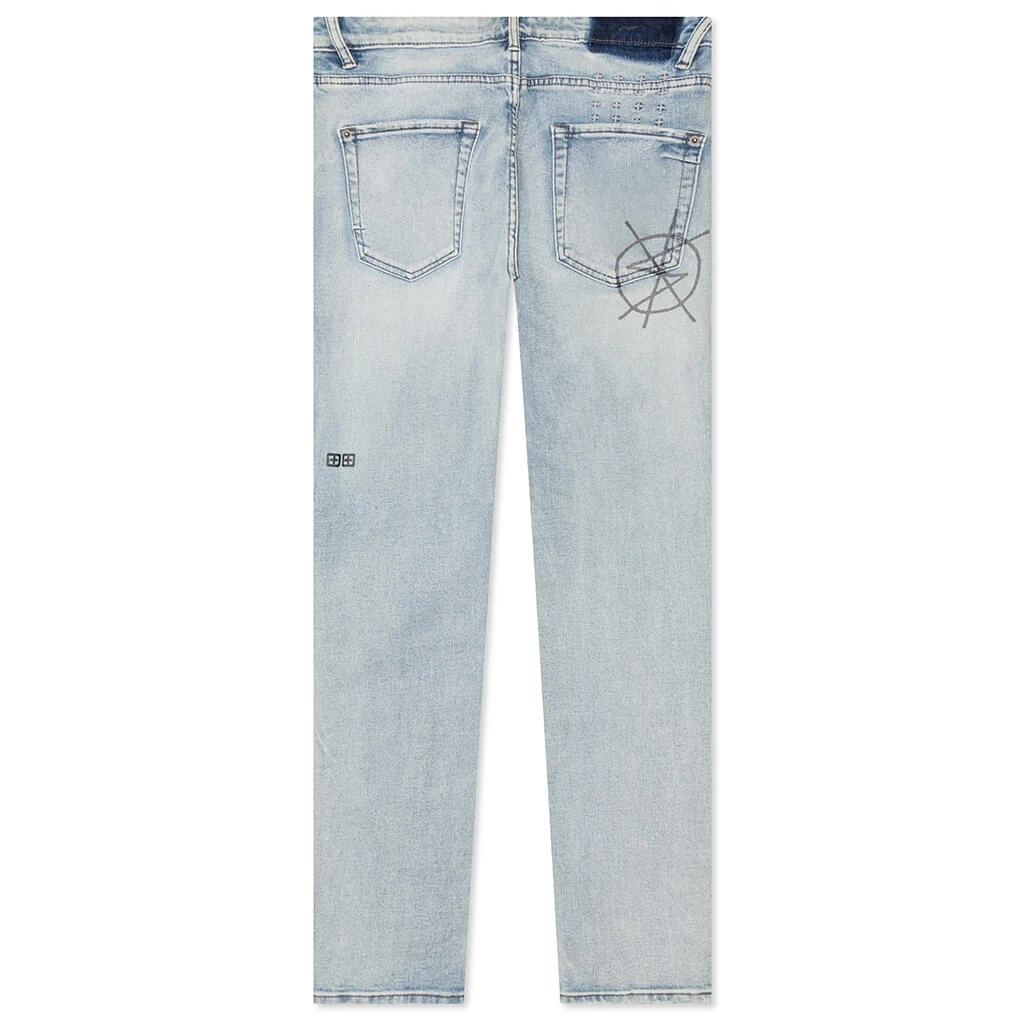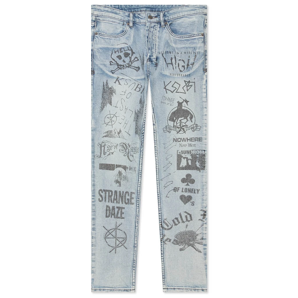 The Van Winkle jeans from Ksubi have become a staple design desired by many. Featured in the Nowhere Punk Blue colorway, the jeans feature signature details including the iconic tag and cross-stitch at the rear. Its comfortable cotton and elastane base includes distressed details, a five-pocket design, and a mid-rise fit.