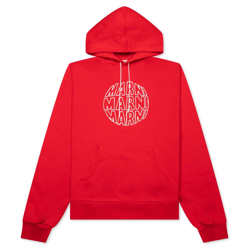 Upgrade your everyday apparel rotation with the Marni Sweatshirt. The contemporary design is constructed with 100% cotton and features a drawstring hood paired with ribbed detailing at the trims. To complete the look, screen-printed Marni branding can be seen on the front. Â