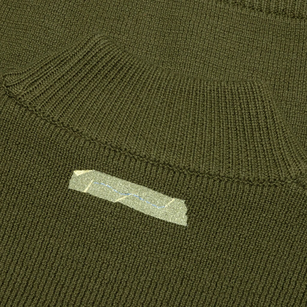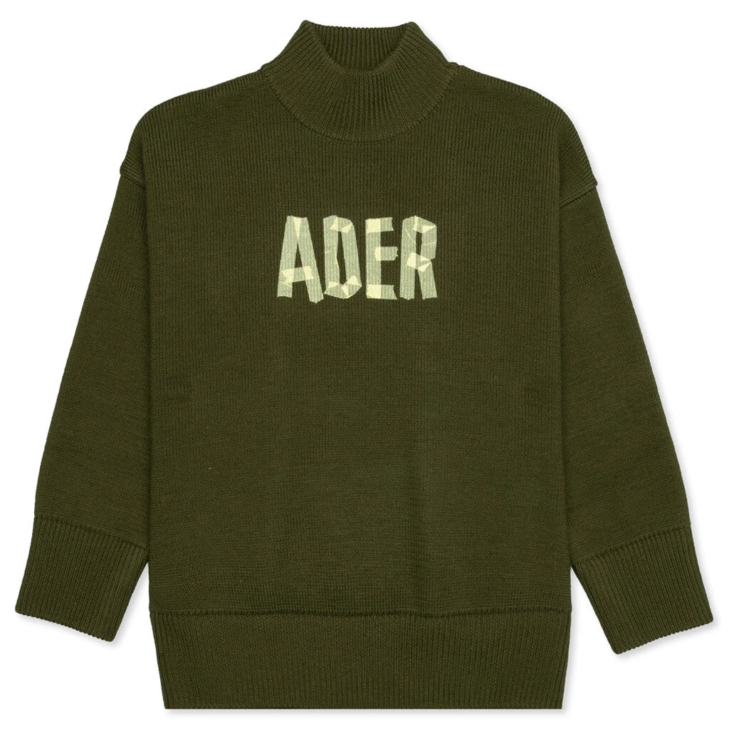Based in Seoul, Ader Error started as an anonymous group of collectives in 2014. The mysterious brand focuses on oversized unisex pieces with emphasis on vibrant colors and heavy use of blue along their garments. Ader Error allows their masterful designs to transcend their identity and speak for themselves. A clever masking tape graphic across the chest and back display the brand’s name sake and signature stitch branding. Pictured is the Ader Error Mask Knit in Khaki.