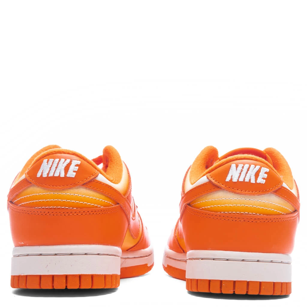 Making a bold statement in its design, the Nike Women’s Dunk Low ‘Magma Orange’ makes an impression with its smooth leather upper. The unique color-bleed effect distinguishes the toe box, collar, and quarter panel. A woven tongue label is seen, while the perforated detailing at the toe box and embroidered branding at the heel provide further detailing. A rubber outsole underneath supports the rest of the design.