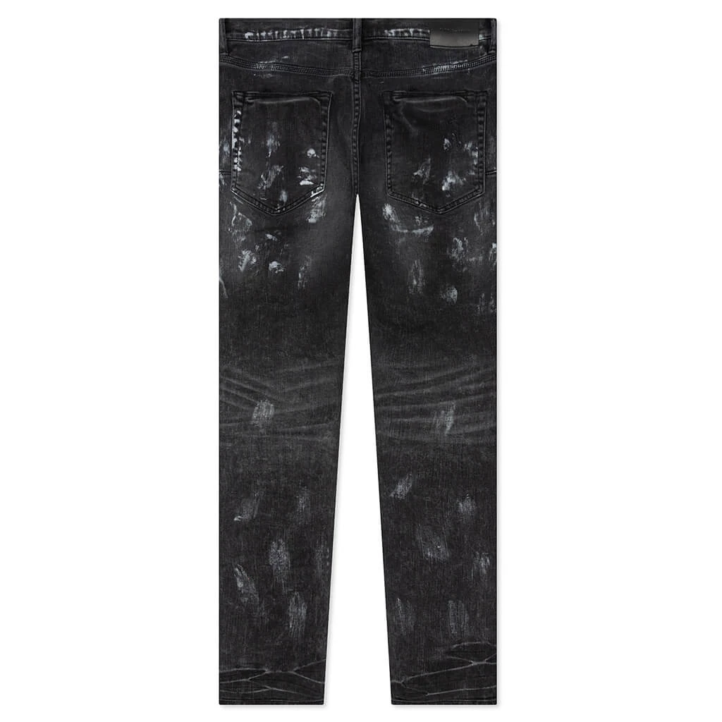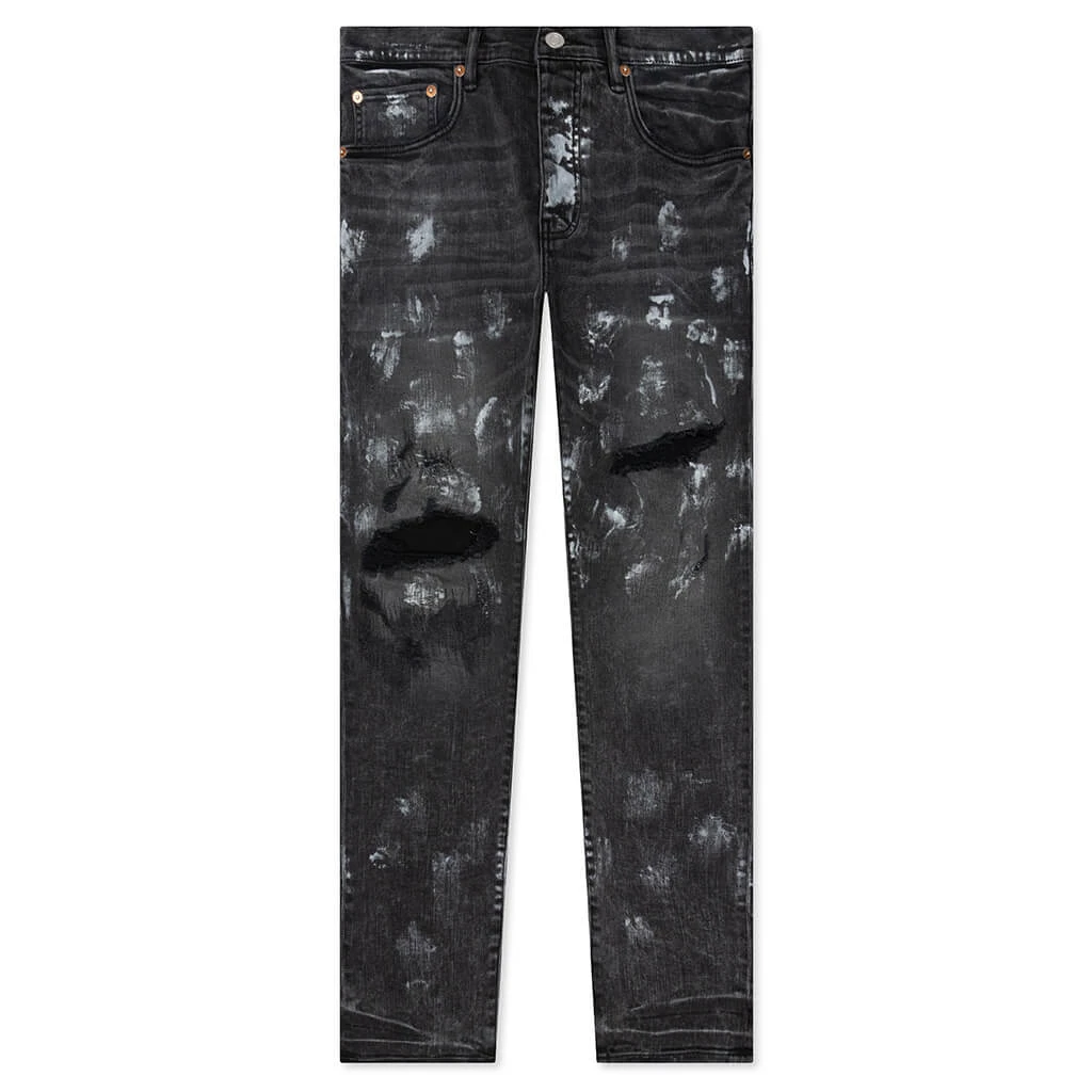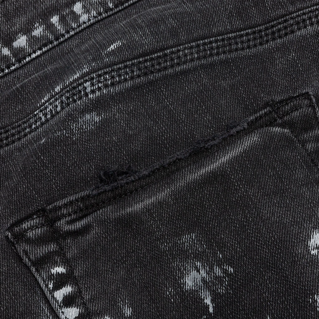 Purple Denim’s P001 seen in a Super Fade Black Weft Repair wash makes a bold statement. The washed-down silhouette is crafted from a blend of cotton and lycra, making the design made for a low rise and skinny fit. Reinforced belt loops appear along with a button fly, while the bold hand-applied distressing, repairs and paint splatters tie together the remainder of the look.