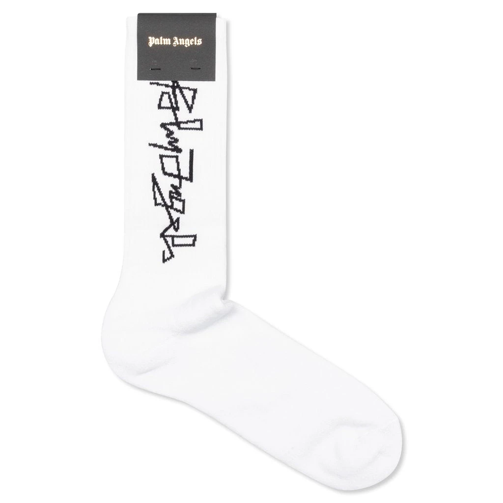 Stemming from a trip to Venice Beach, Francesco Ragazzi began Palm Angels with a coffee table book exploring the Los Angeles skateboarding scene. It was one picture he took that made him vision an image evoking the traditional representation of an angel, which would lead to the concept of Palm Angels. This Milan based label has perfectly blended high fashion with skateboarding inspired designs and 1970s slant. Pictured is the Palm Angels Side Desert Logo Socks – White/Black