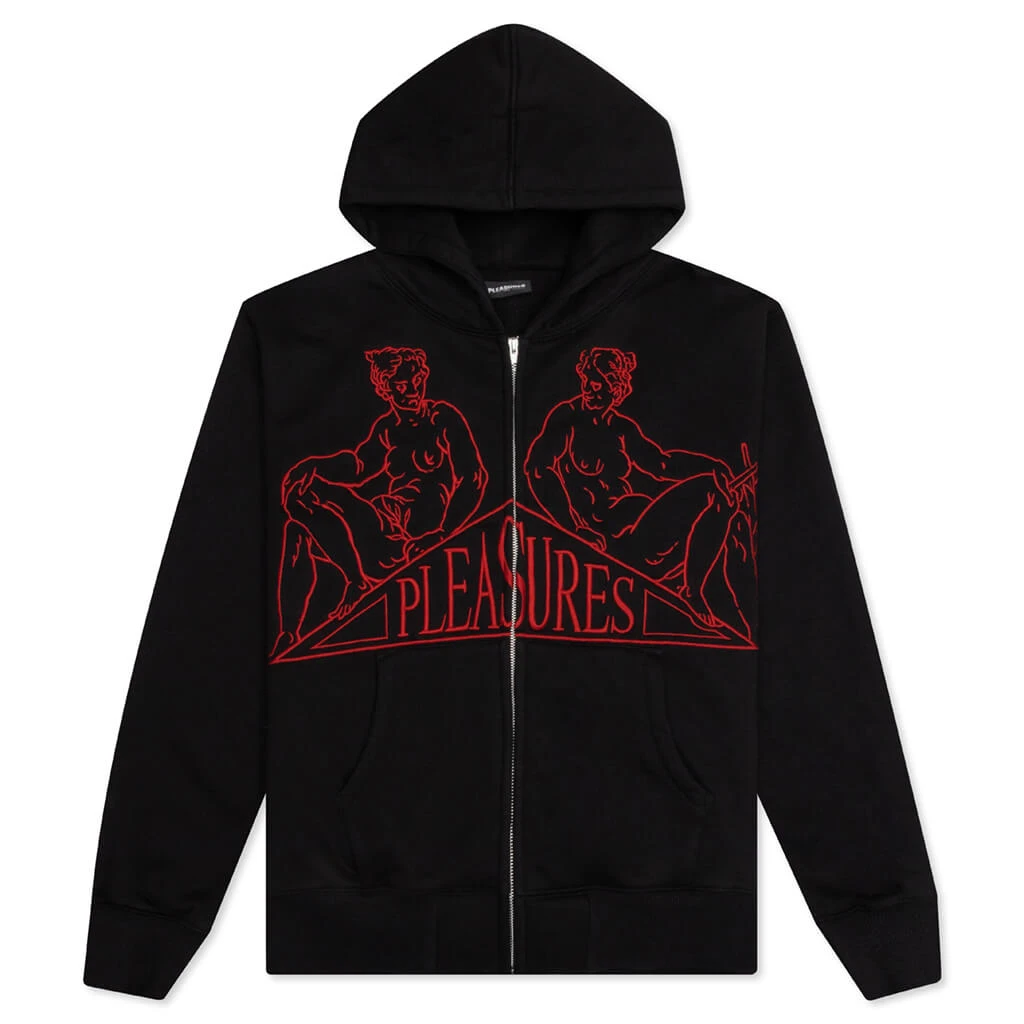 The PLEASURES Squeeze Zip Up Hoodie is a must-have streetwear apparel item. Cut from cotton, the hoodie is garment-dyed and includes a full-zip closure. Made for a relaxed fit, the silhouette includes ribbed detailing at the cuffs and hem. Embroidered branding and graphics at the front finish the look.