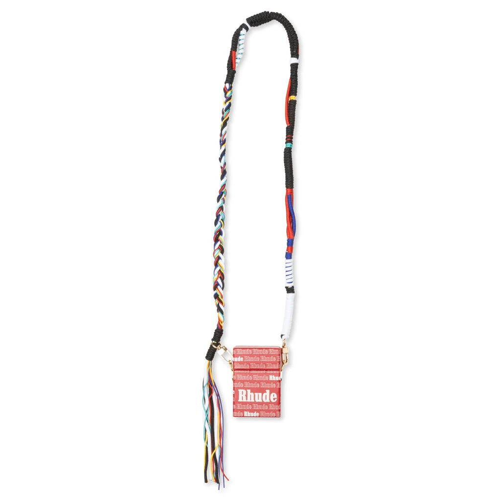 ’s aesthetic emphasizes traditional American logos, the small Cig Bag showcases the brand in a well-recognized font. The cigarette box silhouette is subtle yet eye-catching with a woven and colorful strap to contrast the red hue pattern. The craftsmanship is held in the highest regard by using genuine leather.