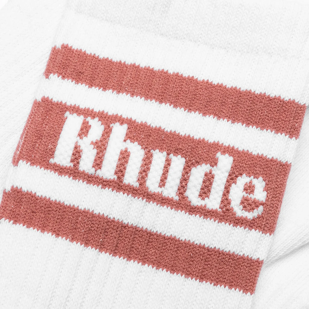 Rhude’s Striped Logo Sock makes an impression with its jacquard logo branding and striped detailing. The ribbed detailing paired with the premium blend of cotton, polyester, and spandex completes the look.
