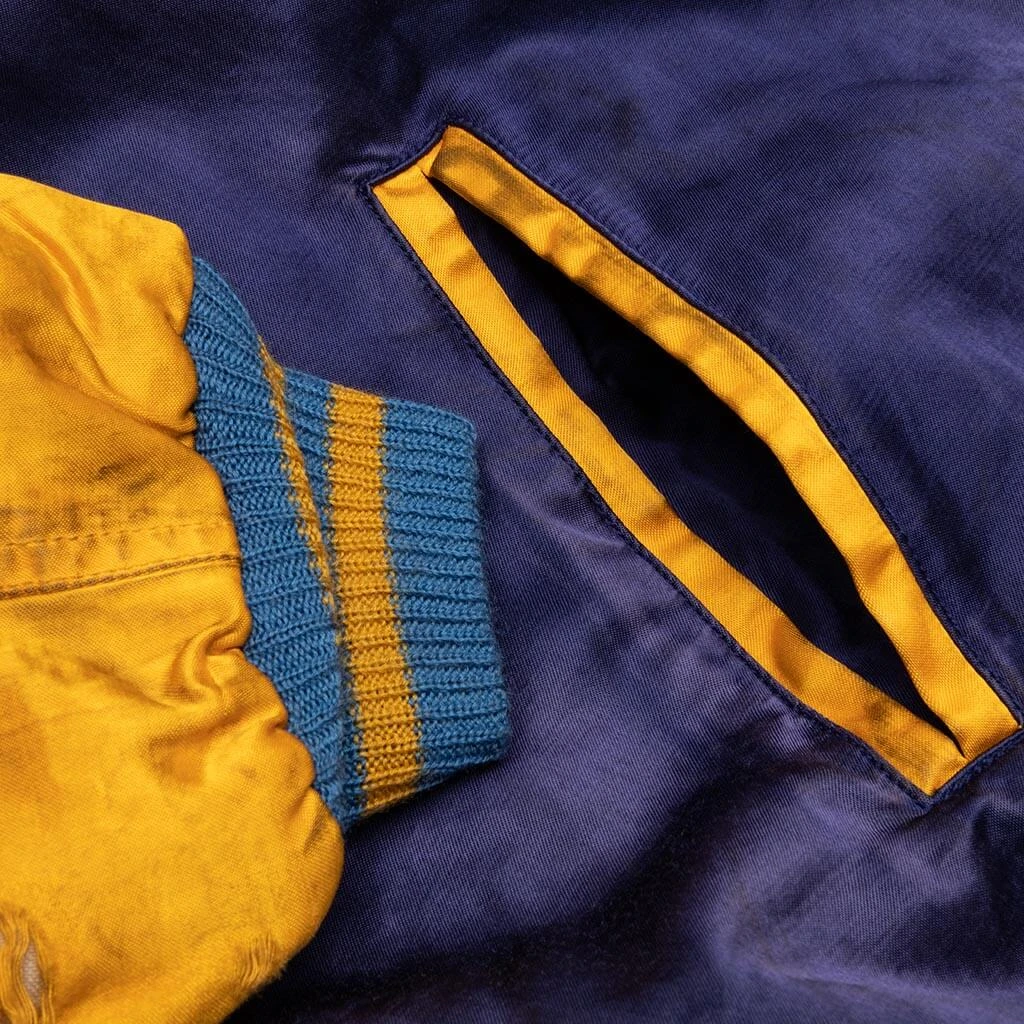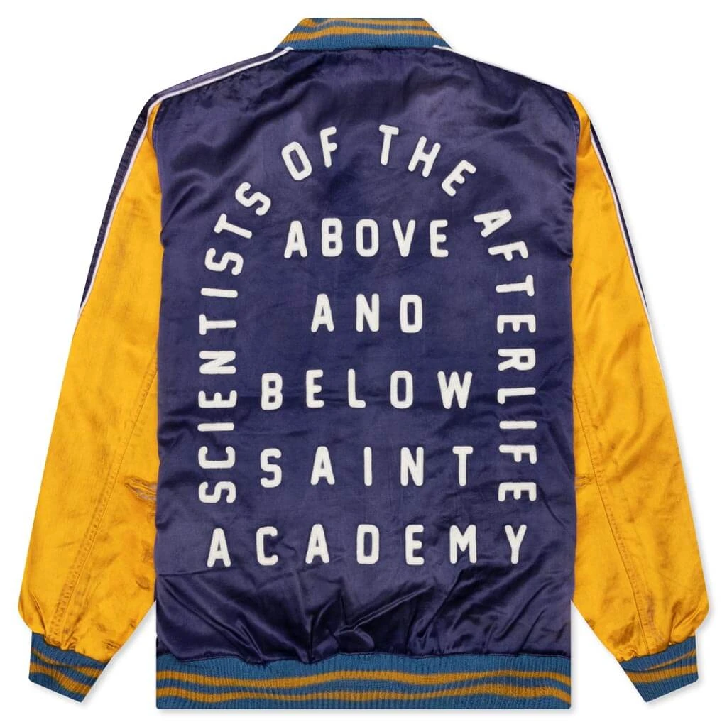The Saint Michael Stadium Jacket features a nylon construction along with a snap button closure down the front in contrast with white piping. Stitched phrasing and branding reside at the front and rear. The hand pockets and striped ribbed trims complete the rest of the look.
