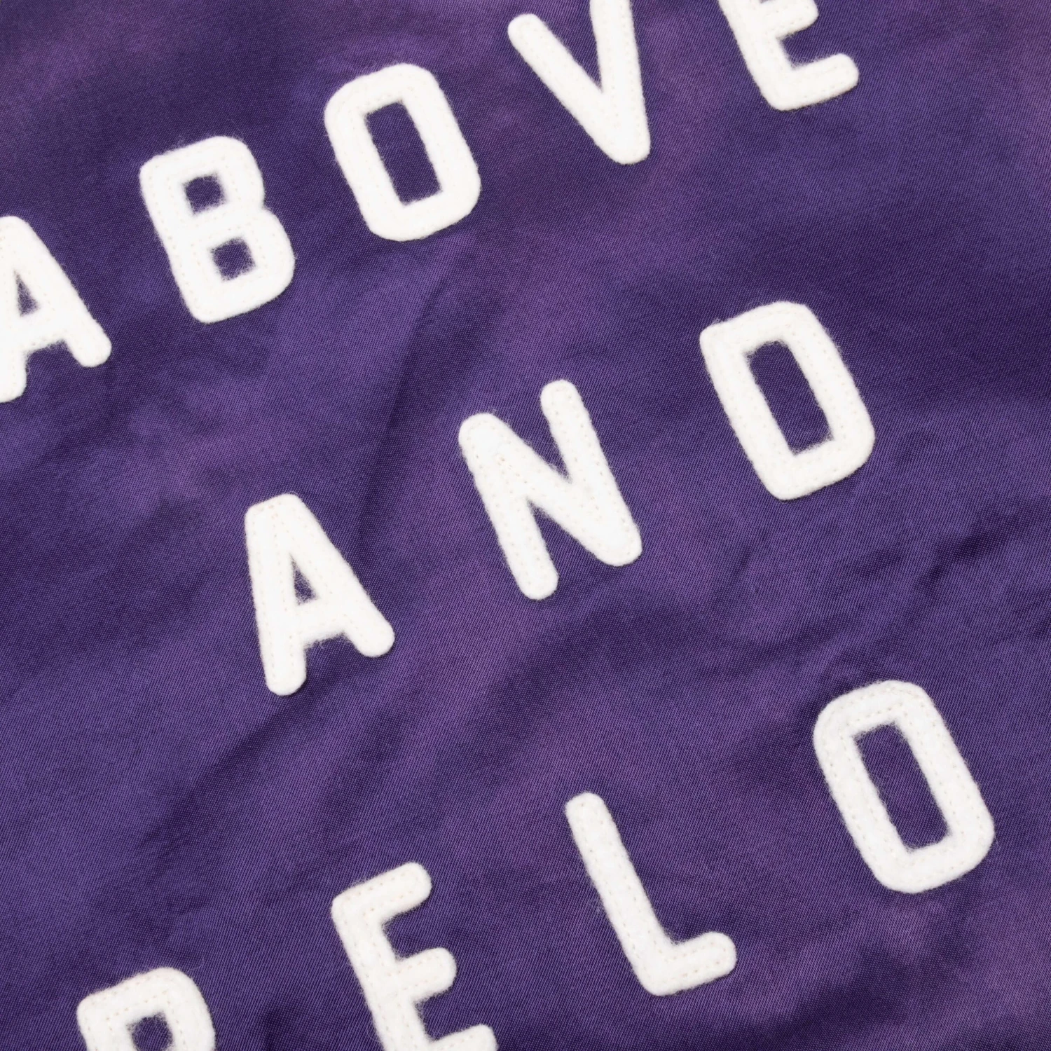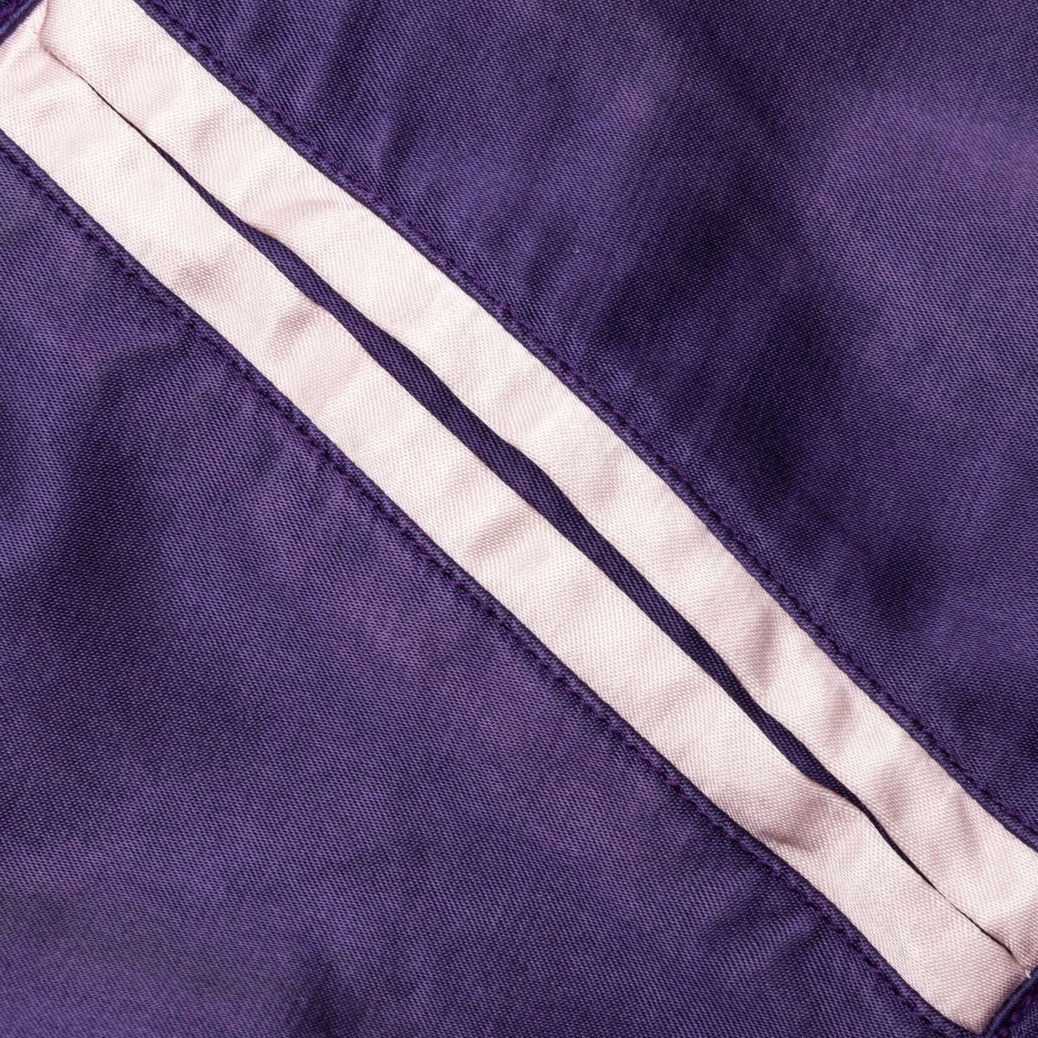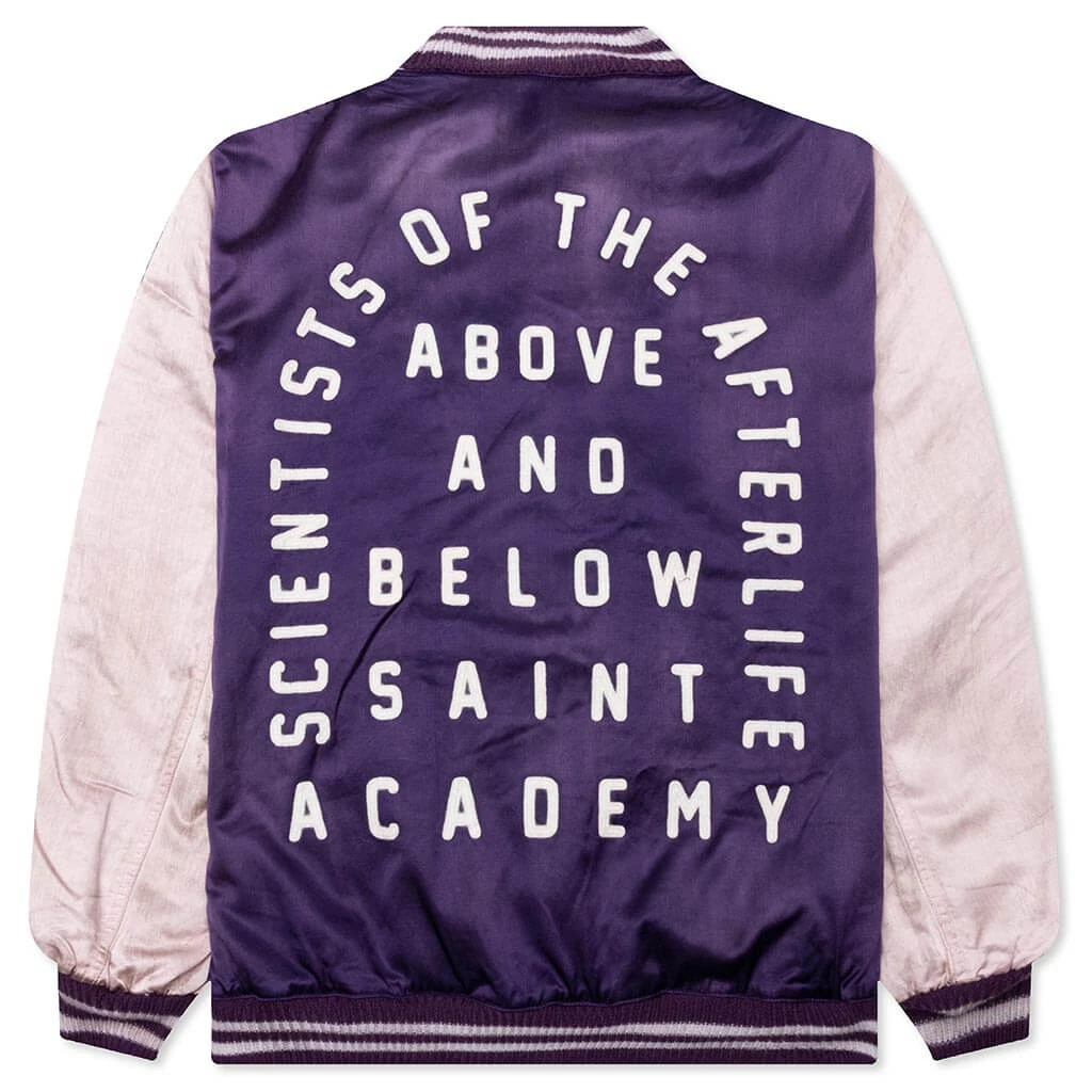 The Saint Michael Stadium Jacket features a nylon construction along with a snap button closure down the front in contrast with white piping. Stitched phrasing and branding reside at the front and rear. The hand pockets and striped ribbed trims complete the rest of the look.