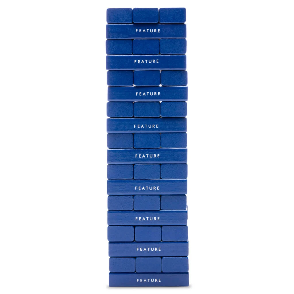 Upgrade your game night while testing the law of gravity with our exclusive FEATURE Tumbler Tower Blocks. Featuring a set of fifty-four wooden blocks in a dazzling blue hue, these blocks make a statement in any living space. Remove a block and stack it on top while preventing the tower from collapsing. Each wooden block is printed with FEATURE branding, while the case is printed with additional FEATURE branding for a completed design.