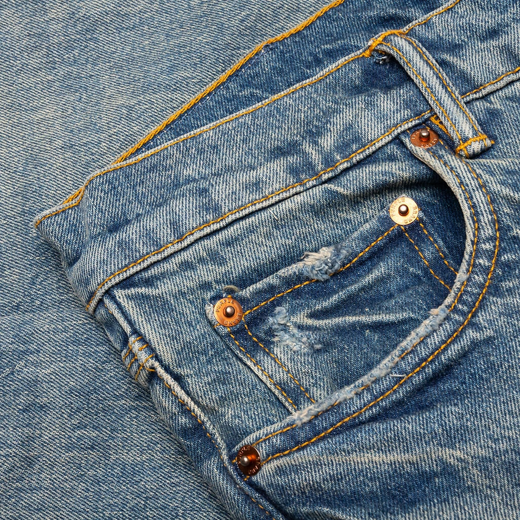 Made for a low-rise boot-cut fit, the P004 Vintage Indigo Destroy from Purple Brand takes on an array of fading and subtle distressing details. Reinforced belt loops are placed as well as a hidden back pocket rivet for added durability. The chambray lining, bar-tack stitching, leather patch, and signature hang tag branding wrap up the rest of the look.